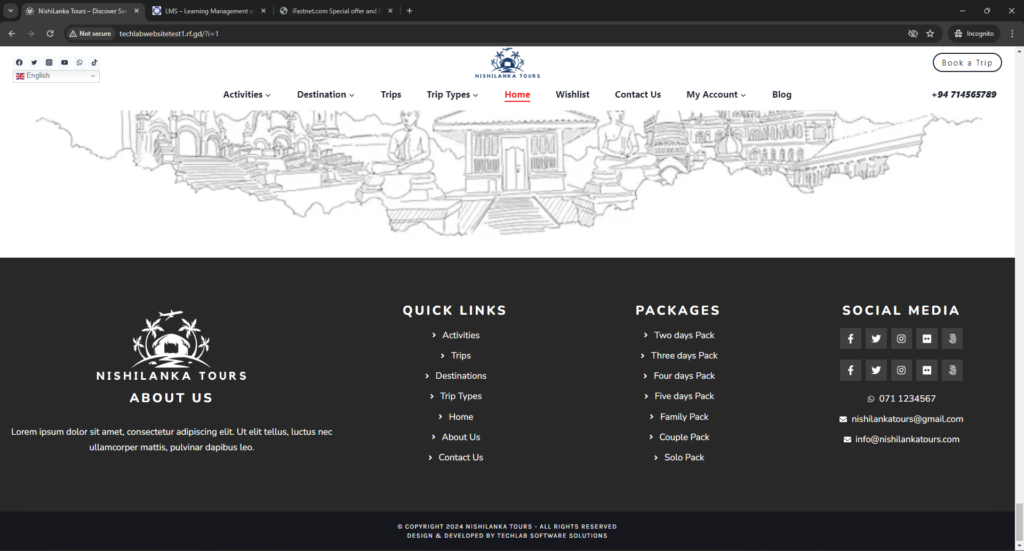 As the lead developer of Nishi Lanka Tours, I spearheaded the development and implementation of the website’s core functionalities. Collaborating closely with tourism experts and stakeholders, I leveraged my expertise in WordPress development to create a platform that showcases the beauty and diversity of Sri Lanka while providing travelers with a seamless booking experience.